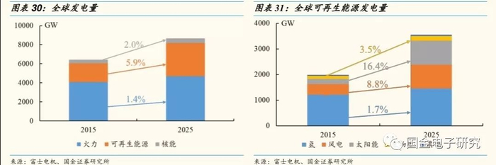 ◾ 由于新能源发电输出的电能不符合电网要求,需通过光伏逆变器或风力发电逆变器将其整流成直流电,再逆变成符合电网要求的交流电后输入并网。IGBT 模块是光伏逆变器和风力发电逆变器的核心器件,新能源发电行业的迅速发展将成为 IGBT 模块行业持续增长的又一动力。2015年全球发电量6414 GW,预计2025年全球发电量将达到8647 GW,10年CAGR为3.0%,其中可再生能源发电量增速较快,CAGR达到5.9%;进一步细分,太阳能发电和风能发电量的增速要高于可再生能源发电量的复合增速,太阳能发电量15-25年CAGR为16.4%,风能发电量CAGR为8.8%,远高于行业的平均增速。从地区来看,风电增长较快的地区包括中国,欧洲和美国,而太阳能发电增长较快的地区则有中国,欧洲,美国和其他亚太地区。