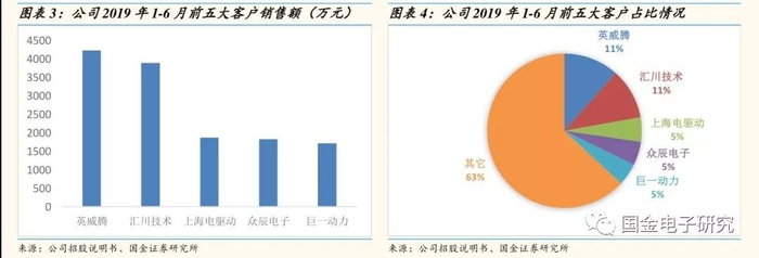 ◾ 公司2019年1-6月前五大客户营收占比37.1%,第一大客户英威腾,营收占比12.3%,第二大客户汇川技术,营收占比8.65%,第三至第五大客户分别是上海电驱动、众辰电子和巨一动力。