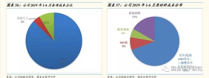 ◾ 芯片占总成本的60.35%:公司产品主要成本是原材料成本,2019年1-6月,原材料成本占比87.21%,制造费用占比8.62%,直接人工占比4.17%。公司IGBT模块原材料包括 IGBT 芯片、快恢复二极管等其他半导体芯片、DBC 板、散热基板,在各种原材料中,芯片作为 IGBT 模块的核心元器件,占比最高,2019年1-6月,IGBT芯片成本占比69.21%。