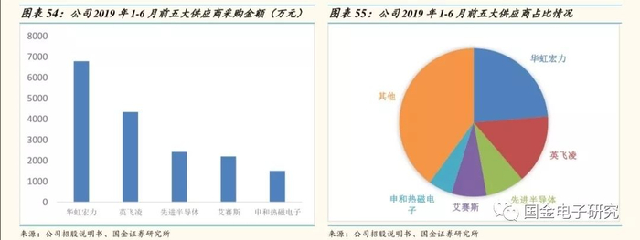 ◾ 公司自己设计的芯片在华虹半导体及先进半导体流片,外购芯片主要来自于英飞凌和艾赛斯,2019年1-6月,公司前三大供应商分别是华虹宏力、英飞凌及先进半导体,前三大供应商合计占比47.27%。
