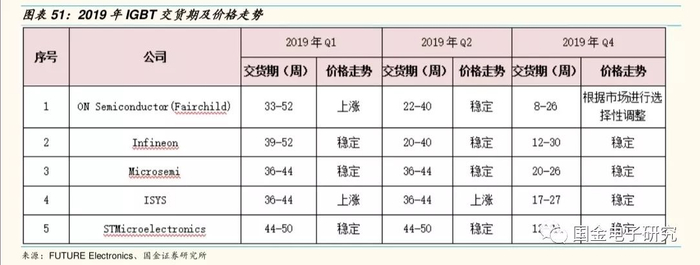 ◾根据FUTURE Electronics数据,2019年国际主流IGBT大厂交货期都在20周以上,最长达到52周,2019年整体价格处于稳定状态。
