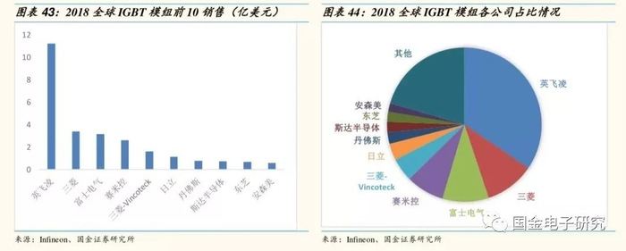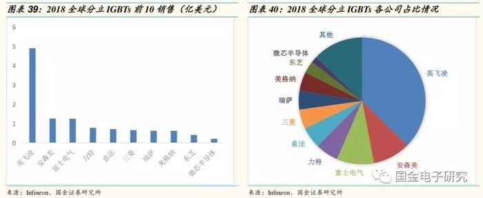 ◾ 全球IGBT市场几乎被欧美日企业垄断,全球最大的IGBT公司是德国英飞凌,位居分立IGBT及IGBT模组第一位,日本三菱则占据IGBT-IPM第一大市场份额。