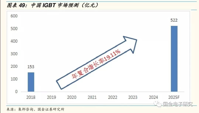 ◾ 2018-2025中国IGBT市场年复合增长率19.11%。根据集邦咨询《2019中国IGBT产业发展及市场报告》,2018年中国IGBT市场规模预计为153亿人民币,相较2017年同比增长19.91%。受益于新能源汽车和工业领域的需求大幅增加,中国IGBT市场规模将持续增长,到2025年,中国IGBT市场规模将达到522亿人民币,年复合增长率达19.11%。