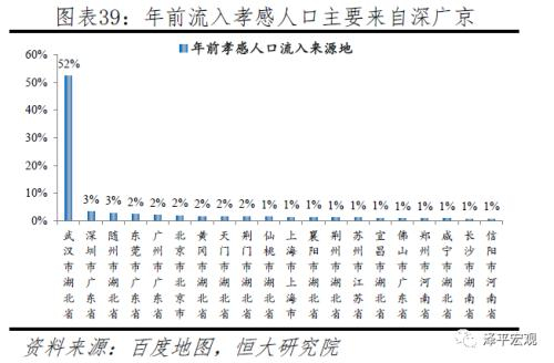 孝感:未来返工人口67%流向湖北省内,20%流向广东、浙江、河南、江苏、北京等5省市,15%流向深圳、东莞、广州、北京等10个省外城市,孝感与湖北省内城市往来更加密切。根据百度地图迁徙大数据,从省级层面看,年前流入孝感的人口中67.1%来自湖北,20%来自广东、浙江、河南、江苏、北京等5省市;从地级层面看,年前流入孝感的人口中65%来自来自同省的武汉、随州、黄冈、天门等10城,14.6%来自省外的深圳、东莞、广州、北京等10城。孝感与武汉和湖北省内城市往来更为密切,这一方面使孝感成为确诊病例第三高城市、仅次于武汉和黄冈,另一方面也意味着未来孝感返工人口将主要流向武汉及省内城市。