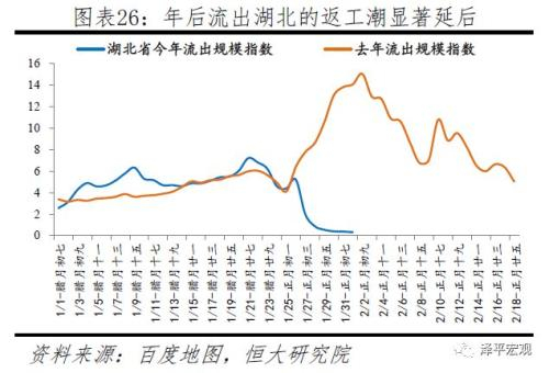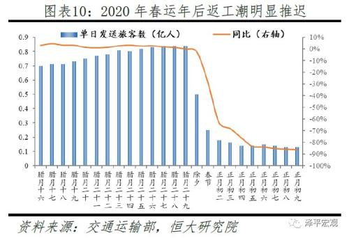2020年春节回乡潮较往年提前,但受疫情影响节后返工潮明显推迟,正月初一至初九客运量合计1.41亿人次,同比减少78%,预计节后返城高峰将在2月8-9日前后开始出现。2020年春运受疫情影响,前22天(1月10日-2月2日)全国累计发送旅客12.84亿人次,较去年同期下降27.5%。年前回乡潮主要集中于腊月二十一至二十九(1月15日-23日),客运量合计7.33亿人次,占年前回乡潮的64.1%,而2019年主要集中于腊月二十五至二十九。由于疫情爆发,各地企业复工时间明显推迟,国务院将春节假期延至2月2日,多数省份规定企业复工时间不早于2月9日,湖北规定不早于2月13日,这使得返城高峰仍未出现。根据交通运输部统计,正月初一至初九(1月25日-2月2日)客运量合计1.41亿人次,远低于2019年6.55亿人次,同比减少78%。比如,根据百度地图迁徙大数据,2019年北京的返城高峰主要出现在正月初六至初九,其中正月初三至初八迁徙规模指数均高于10,初七、初八高于20;2020年同期迁徙规模指数在5附近徘徊,峰值低于6.5。从历史数据看,2016-2019年铁路客运量高峰均出现在正月初七和正月十六,正月初七多为白领返工潮,正月十六是元宵节后农民工和大学生返程。随着元宵节(2月8日)及多数省份复工时间(2月10日)临近,预计2020年节后返城高峰将在2月8-9日前后开始出现。
