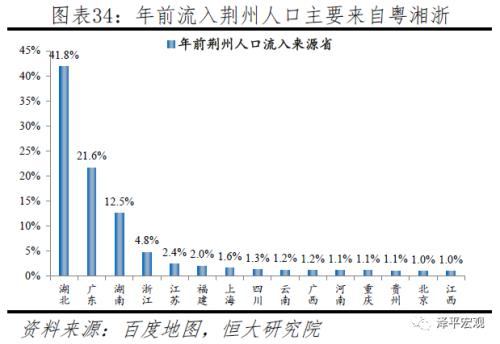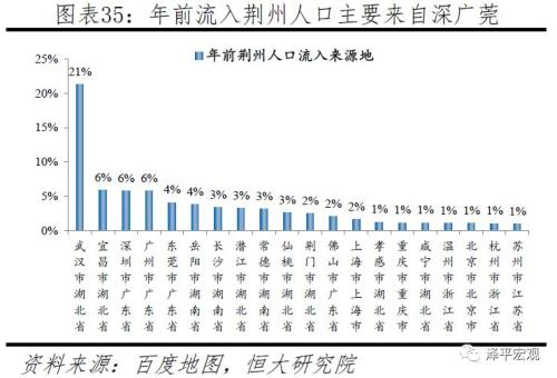 荆州:未来返工人口的42%将流向湖北其他城市,43%将流向广东、湖南、浙江、江苏、福建等5省,35%流向深圳、广州、东莞、岳阳等13个省外城市。根据百度地图迁徙大数据,从省级层面看,年前流入荆州的人口中41.8%来自湖北,43.3%来自广东、湖南、浙江、江苏、福建等5省;从地级层面看,年前流入荆州的人口中37.9%来自同省的武汉、宜昌、潜江、仙桃等7城,34.6%来自省外的深圳、广州、东莞、岳阳等13城。