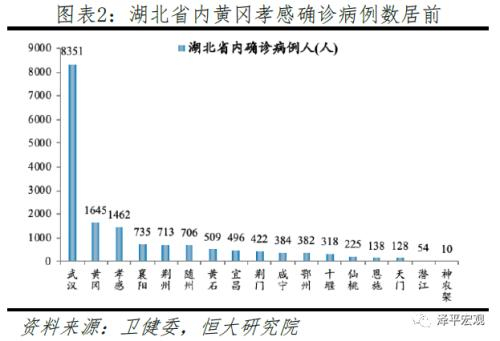 节前从武汉流出的500多万人口约59%流入省内,其中23%流入黄冈、孝感,这与当前68%的确诊案例在湖北省内、和黄冈孝感疫情突出基本对应。新冠肺炎疫情的发源地在武汉,当前发现的绝大多数病例为武汉输入型,疫情扩散与人口流动显著相关。武汉市现有常住人口约1100万,户籍人口近900万,实际管理人口(含短期流动人口)约1400万,节前从武汉流出的500万人口主要分为非武汉籍高校学生、外来务工经商人员、外来商务旅游人员、反向春运人员、外出旅游人员等。实际上,考虑到武汉的九省通衢位置,节前返乡在武汉中转的人口或还有数百万级,这意味着从武汉流出的人口规模实际更大。根据包括短期流动人口统计的百度地图迁徙大数据,1月10-24日从武汉流出人口的59.1%流入湖北省内其他城市,其中孝感、黄冈、鄂州、咸宁、荆州分分别占12.4%、10.2%、5.5%、5.4%、4.8%。武汉人口的主要流向地也是当前疫情的主要发生地。截至2020年2月4日24点,湖北确诊案例为16678人,占全国确诊病例24363人的比重达68.5%,其中省内的武汉、黄冈、孝感、襄阳、荆州、随州是确诊病例最多的城市,分别为8351、1645、1462、735、713、706人,合计占湖北和全国确诊病例的81.6%、55.9%,前3城合计占湖北和全国确诊病例的68.7%、47.0%。