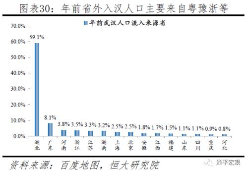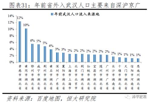未来武汉返工人口的近6成将流向湖北其他城市,22%流向广东、河南、浙江、江苏、湖南等5省,13%流向深圳、上海、北京、广州等6个省外城市。武汉是新型冠状病毒肺炎的发源地,未来流出武汉的返工人口流向是关注的重中之重。武汉户籍人口占湖北省约1/7,且武汉户籍人口外出务工比例应低于湖北其他地区,在封城状态下当前武汉有人口约900万,年后武汉人口流出规模应在几十万规模。但武汉是全国主要交通枢纽,大量人口从武汉中转,因此途径武汉外流的人口流向也值得关注。根据百度地图迁徙大数据,从省级层面看,年前流入武汉的人口中59.1%来自湖北,21.9%来自广东、河南、浙江、江苏、湖南等5省;从地级层面看,年前流入武汉的人口中57.9%来自同省的孝感、黄冈、鄂州、咸宁等14城,12.7%来自省外的深圳、上海、北京、广州、长沙、信阳等6城。