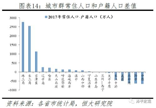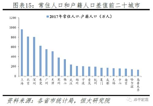 在城市层面,2017年一线、二线城市、三四线城市常住人口与户籍人口的差值为3134万、4991万、-7717万,其中上海、深圳、北京、东莞、广州等地外来人口均超500万。分线城市看,2017年一线、二线、三四线城市常住人口与户籍人口的差值约为3134万人、4991万人、-7717万人。经济发达地区凭借良好的就业机会和优质的公共资源,吸引大量区外人口就业和居住。分城市来看,上海、深圳、北京、东莞、广州常住人口与户籍人口的差值均超500万,居全国前五,这些城市主要分布在珠三角、长三角、京津冀等城市群,三大城市群常住人口与户籍人口的差值分别为2766、2542、1131万人。周口、阜阳、毕节、信阳、驻马店、商丘常住人口与户籍人口的差值均小于-200万人,居全国倒数前五。并且,城市群内部人口流动频繁,比如在长三角城市群,根据包括短期人口流动统计的百度地图迁徙大数据,2020年春节前(1月10日至24日)上海市流入人口(含中转)中约63%来自江苏和浙江,其中苏州、杭州、嘉兴、南通、无锡居前五位,合计占比达41%;南京、苏州流入人口(含中转)主要来自安徽省和苏北地区,而杭州、宁波主要来自浙南地区。