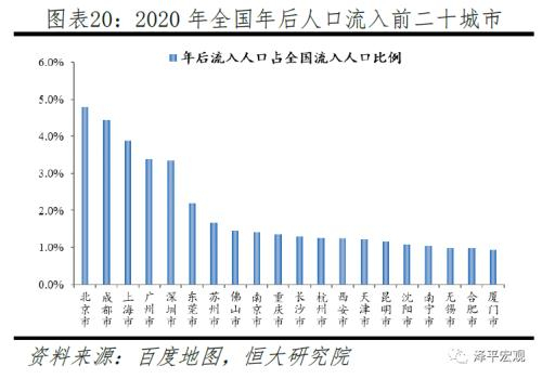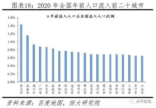 2、返工潮背景下人将往哪里去?1)疫情影响下节后返工潮明显推迟。人口迁移的基本逻辑是人随产业走、人往高处走,中国人口长期持续向大城市大都市圈集聚,每年春节前后出现规模约30亿人次的“回乡潮”和“返工潮”。2020年春节回乡潮较往年提前,但受疫情影响节后返工潮明显推迟,正月初一至初九客运量合计1.41亿人次,同比减少78%,预计节后返城高峰将在2月8-9日前后开始出现。2)超6成省际迁移人口流向粤浙沪苏京。在省级层面,当前户籍与居住地不同的省际迁移人口中64%流向粤浙沪苏京,50%来自皖豫川湘赣鄂。在城市层面,2017年一线、二线城市、三四线城市常住人口与户籍人口的差值为3134万、4991万、-7717万,其中上海、深圳、北京、东莞、广州等地外来人口均超500万。春运期间人口短期流入流出均较多的城市主要分布在京津冀、长三角、珠三角、成渝等城市群。人口流动的主要交通枢纽除一二线城市外,还主要途经金华、惠州、常州等城市群节点城市。