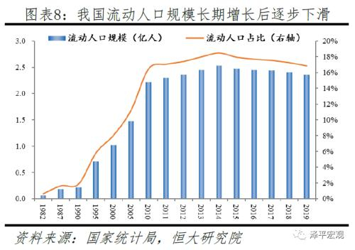 人口迁移的基本逻辑是人随产业走、人往高处走,中国人口长期持续向大城市大都市圈集聚,每年春节前后出现规模约30亿人次的“回乡潮”和“返工潮”。1991-2000年、2001-2010年、2011-2015年、2016-2018年期间,一线城市人口年均增速分别为3.9%、3.4%、1.5%、1.4%,二线城市分别为1.9%、1.8%、1.0%、1.1%,三四线合计人口年均增速分别为0.63%、0.37%、0.30%、0.27%,全国人口平均增速为1.04%、0.57%、0.50%、0.50%(由于统计上各地区人口加总不等于全国,三四线合计人口为全国剔除一二线得到,与三线、四线人口不完全吻合)。这表明一二线城市常住人口流入放缓但仍保持集聚,三四线人口持续净流出。2018年一线、二线、三线、四线城市经济-人口比值分别为2.3、1.6、1.0、0.6,这预示着未来人口将继续向少数地区、向大城市大都市圈集聚。由于户籍制度限制及“过年回家”情结,中国春运呈现显著“钟摆式流动”特征,即年前停工回乡、节后返城复工,此外部分城市存在“反向春运”现象,每年春节前后出现人次约30亿级的大规模人口流动。中国流动人口规模在2014年达2.53亿的峰值,2019年降至2.36亿人,其中主要为外出农民工,2019年达1.74亿人;与流动人口情况对应,2014-2019年春运发送旅客数量从36.2亿人次下降为29.8亿人次。