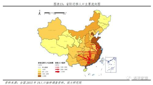 在省级层面,户籍与常住地不同的省际迁移人口中64%流向粤浙沪苏京,50%来自皖豫川湘赣鄂。不同地区的人口迁移具有显著的空间异质性,省际迁移人口主要从中西部流向东部沿海地区。从目的地看,根据2015年全国1%人口抽样调查资料,省际迁移人口流入规模前五位的地区为广东、浙江、上海、江苏、北京,五省合计占全国的63.5%,广东流入人口主要源地为湖南(22.2%)、广西(18.3%)、湖北(10.6%),浙江流入人口主要源地为安徽(18.8%)、江西(13.0%)、贵州(12.4%),上海流入人口主要源地为安徽(27.9%)、江苏(16.6%)、河南(10.0%)。上述粤浙沪苏京五省省际迁移人口占常住人口的比重分别为22.2%、21.2%、39.5%、10.9%、35.5%,远超全国平均的7.1%。从来源地看,省际迁移人口流出规模前六位的地区为安徽、河南、四川、湖南、江西、湖北,六省合计占全国50.1%。具体来看,安徽流出人口的主要目的地为江苏、浙江、上海,合计占比75.8%,河南流出人口的主要目的地为广东、江苏、浙江,合计占比45.7%,四川流出人口的主要目的地为广东、浙江、重庆,合计占比51.5%。从省际流向规模来看,湖南、广西、湖北、四川向广东的省际迁移规模均大于250万人,其中全国最大省际迁移流向为湖南至广东,超过500万人。从省际双向流动来看,苏浙、川渝、粤桂之间有较大规模的双向流动。