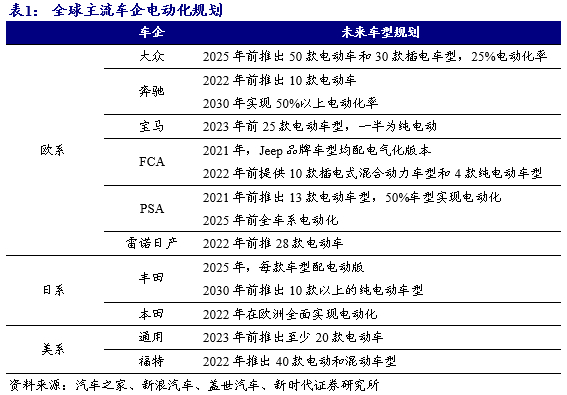 全球主流车企加速电动化,欧洲车企最为明显。政策端, 欧洲、美国和日本对汽车碳排放都提出的明确目标,其中,欧盟标准最为严格。按照规划,2021年达标值为95g/km,2025年为81g/km,2030年为62g/km,超标还有相应的处罚。并且,为了刺激电动车发展,德国将2020年底结束的新能源汽车补贴计划延长至2025年底,并且补贴上限较原方案增加25%以上。供给端,全球主流车企发布汽车电动化规划,至2025年发布多款车型。