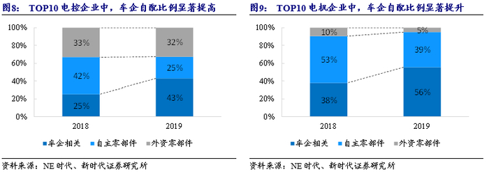 2019年TOP10电机电控企业中车企自配占比提升18 pcts,外资零部件企业电控占比稳定在33%。2019年TOP10电控企业中,车企相关/自主零部件/外资零部件公司装机量分别为33.2/19.2/25.1万套,占比分别为43%/25%/32%。2019年TOP10电机企业中,车企相关/自主零部件/外资零部件公司装机量分别为36.6/29/8万套,占比分别为50%/39%/11%。相比2018年,2019年TOP10电机电控企业中,车企自配占比提升明显,增加了18 pcts,外资零部件企业电控占比稳定,维持在33%左右。