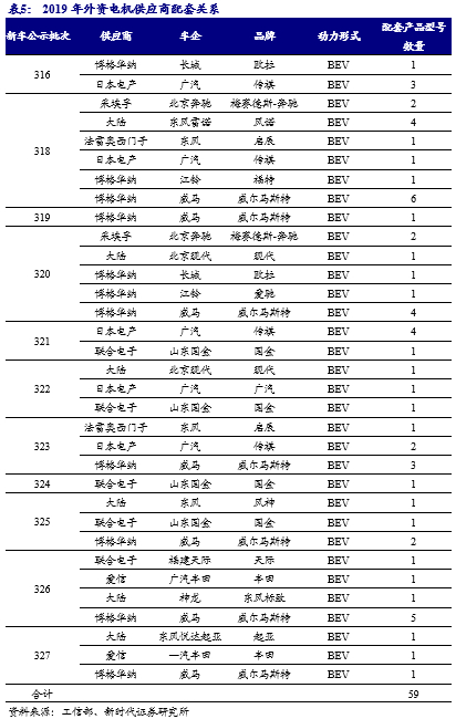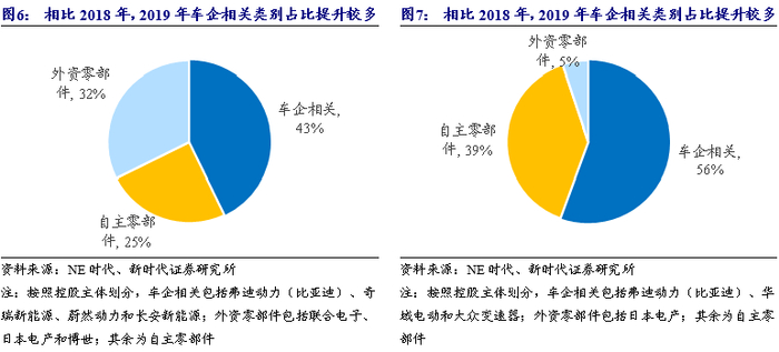 2019年外资零部件供应商配套车型有所增长。2019年新车公示中,外资零部件配套59个产品型号,较2018年27个配套产品型号增加明显,占比份额提升7 pcts。自主零部件配套占比下降7 pcts。车企相关企业配套产品型号数量和份额几乎不变,依然保持较大份额。