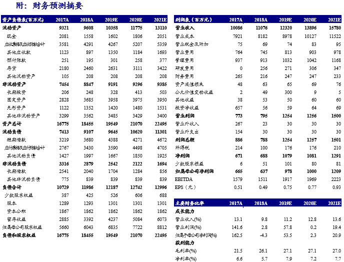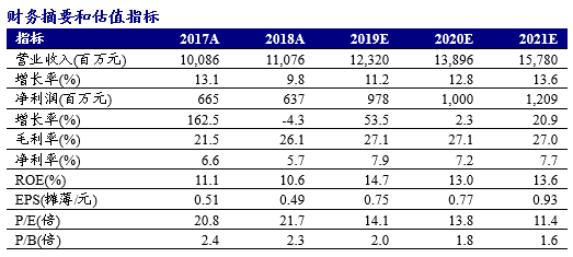 我们预计公司2019-2021年归母净利润分别为9.78/10/12.1亿元,对应EPS分别为0.75/0.77/0.93元,当前股价对应2019-2021年PE分别为14.1、13.8和11.4倍,给予“强烈推荐”评级。
