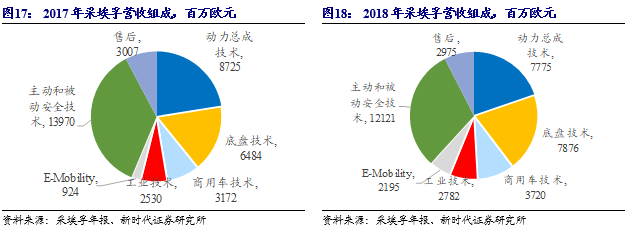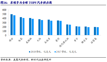 采埃孚为全球TOP5汽车供应商,积极拥抱电动化。根据《美国汽车新闻》发布的数据,采埃孚多年为全球汽车零部件供应商的前五。采埃孚主要业务有主动/被动安全技术、动力总成技术、底盘技术、商用车技术和电驱动。其中,电驱动业务部门成立于2016年 1月,主要包括电子系统、电驱动系统等。近几年电驱动发展迅速,2018年该部门营收为21.95亿欧元,同比增长138%。