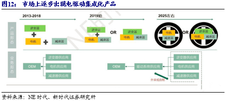 随着电驱动系统集成度不断提升,将会出现集成化产品取代原有的电机、逆变器、减速器等零部件供应商。目前,市场已经出现电机、减速器二合一产品和电机、逆变器、减速器三合一产品。