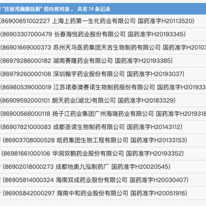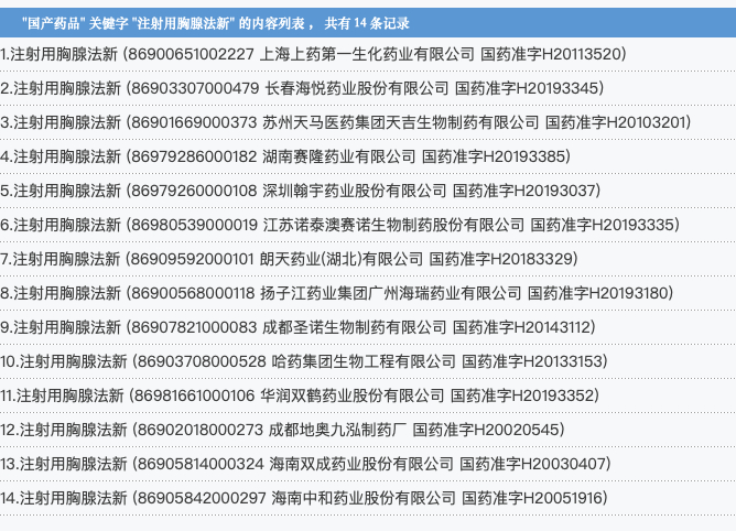 目前,双成药业(002693)、安科生物(300009)、翰宇药业(300199)和赛隆药业(002898)等公司生产该产品。查询国家药品监督管理局,目前有14个公司获得注射用胸腺法新批准文号。