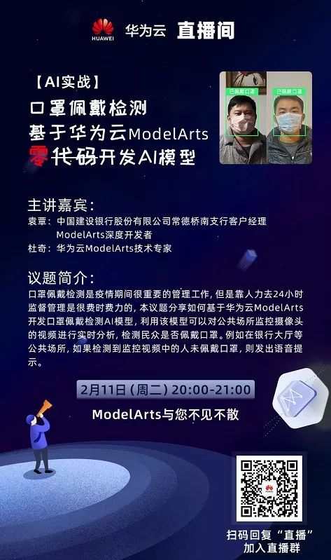 本次直播将分享如何基于华为云ModelArts,零代码开发口罩佩戴检测AI模型,来对公共场所监控摄像头的视频进行实时分析,检测民众是否佩戴口罩。