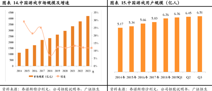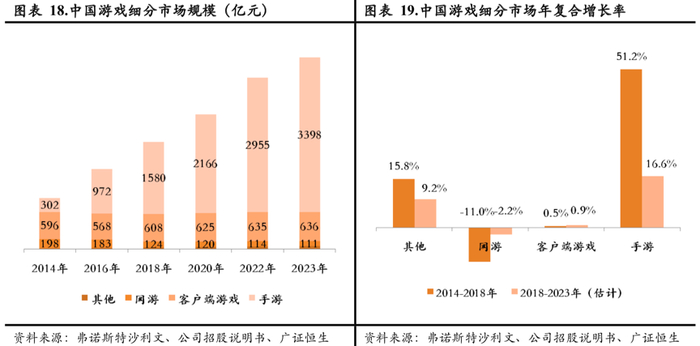 再看中国市场。2018年,中国已经成为全球最大的游戏市场,2018年市场规模已达2357亿元,拥有巨大的体量。尽管在2018年后,随着步入成熟期,中国游戏市场整体收入增速开始放缓,但预计2019-2023年内仍有望维持12.3%的年复合增长率。