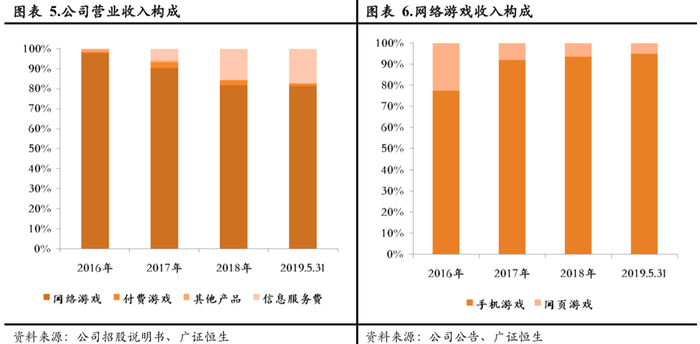 从营收看,心动公司的营收来源可分为游戏业务和信息服务费两大类。其中,游戏业务包括付费游戏、网络游戏和其他产品在内;信息服务费则主要是在TapTap上向游戏开发商收取的广告费。总体上看,网络游戏带来的营收仍然占据绝对优势,但占比逐渐下降,由2016年的97.83%降至2019年5月截止的81.33%;而TapTap带来的信息服务费占比逐步增加,2018年占比已经超过15%。