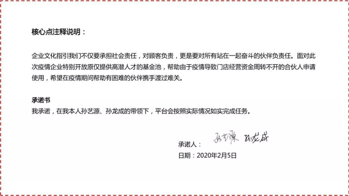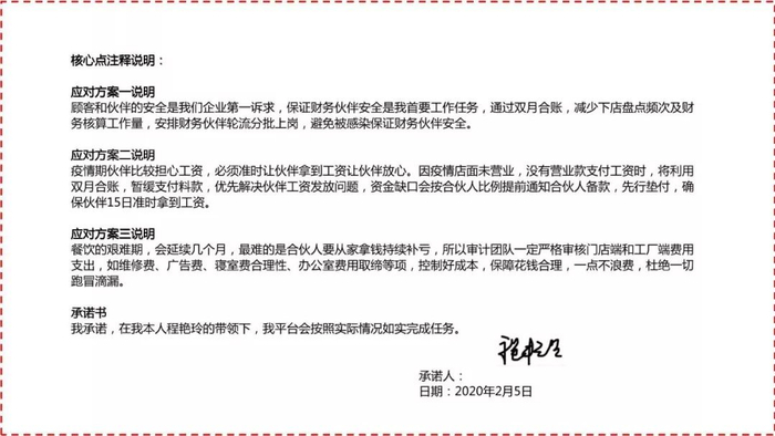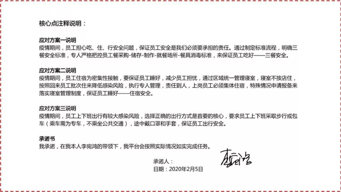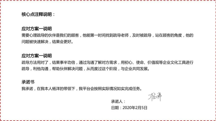 这个承诺书是工具,能稳定军心。这也是企业文化的一种体现,等于向员工表了一个态,留住员工的心是关键。大难见真情,员工很在意大难面前老板的反应,承诺书可以让员工更有归属感。即便所有的员工都感觉到行业的困难,企业也绝不会关门,也正是这样的企业值得员工一辈子追随。