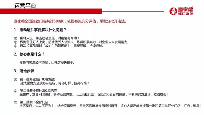 我们在不同阶段,将不同商圈的门店有计划有节奏地分三批开业:第1批预计开83家店,第2批预计开201家,第3批开余下门店。