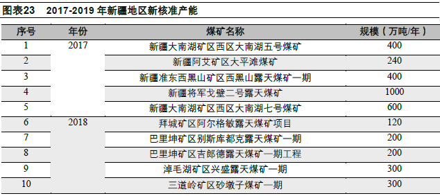 在煤炭发展规模上,截至2018年底,国家能源局公告的煤炭生产产能约1.68亿吨/年,占全国总产能的4.75%,另外在建产能2465万吨。近年来,煤矿落后产能的关闭退出,目前新疆持证煤矿平均单井规模已提高至178万吨/年。2017-2019年新疆地区新核准产能0.94亿。