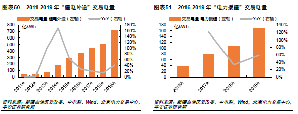疆电外送潜力较大。由于自身消纳能力有限,外送能力不足,“疆电外送”成为助力新疆消纳富余电力、拉动地方经济增长的重要举措。2019年新疆电网“疆电外送”规模达712亿千瓦时,是2018年的1.4倍,“疆电外送”范围覆盖全国19个省(直辖市)。其中,“电力援疆”完成电量167.9亿千瓦时,是2018年的1.6倍。“两交两直”4条外送通道充分保障哈密、准东两大全国性煤电基地和新能源电量消纳,在建、储备项目充足。