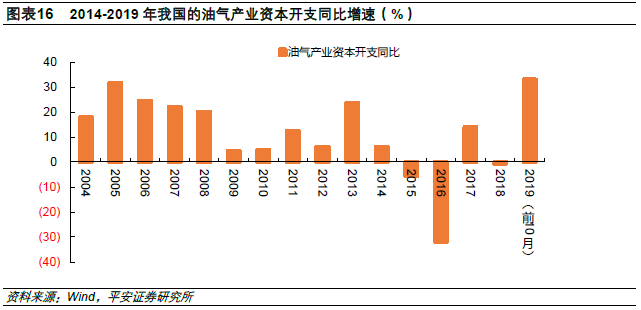 2017-2019年,国内油气资本开支均为同比正增长,油气资本开支的增长是近些年国内油气勘探成果显著的重要原因之一。2019年在保障能源安全战略任务的要求下,三桶油均逆势加大了对上游勘探生产的力度,2019年前三季度,油气产业资本开支同比增长30%。