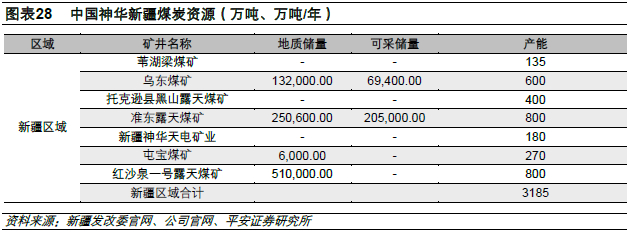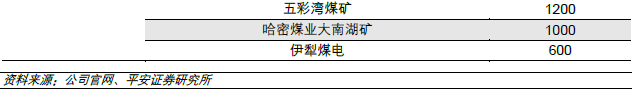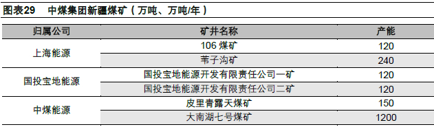 中煤集团下属中煤能源、上海能源、国投宝地能源等均在新疆开发布局煤炭。中煤能源新疆分公司负责中煤能源在疆项目开发建设和生产经营管理工作,旗下包括伊犁煤电化公司、哈密能源公司、伊犁犁能煤炭公司等。哈密能源公司下辖大南湖七号煤矿资源总量25亿吨,设计产能1200万吨/年;新疆伊犁犁能煤炭有限公司下辖皮里青露天煤矿核定产能为150万吨/年。上海能源、国投宝地能源等在新疆分别拥有360、240万吨/年产能。