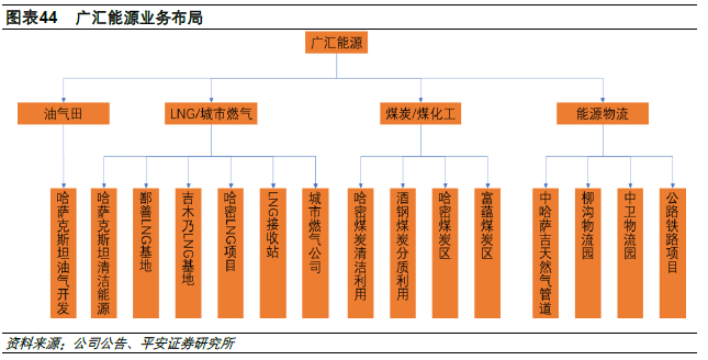 公司业务立足新疆,同时在中亚和国内其他省份布局相关业务。油气方面在中亚在哈萨克斯坦共和国境内已获取丰富的油气资源储备;煤炭方面在哈密淖毛湖和阿勒泰富蕴两大煤区拥有伊吾、白石湖、黑顶山、淖东、淖西、阿勒安道六大煤田,勘探储量累计超过180亿吨;天然气加工和销售方面,公司旗下有多家LNG工厂、天然气管道项目、LNG接收站和城市燃气项目;能源物流方面有甘肃酒嘉园区、宁夏中卫园区、铁路和公路等。