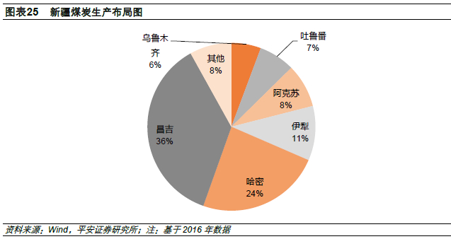 煤炭生产主要集中东疆的准东和哈密。2016年新疆煤炭产量达到1000万吨以上的地州5个,分别是准东地区的昌吉,吐哈地区的哈密、吐鲁番,伊犁州和库拜地区的阿克苏,共1.39亿吨,占全区的86.3%。东疆的准东和吐哈两个地区的煤炭产量占到全区的3/4左右。