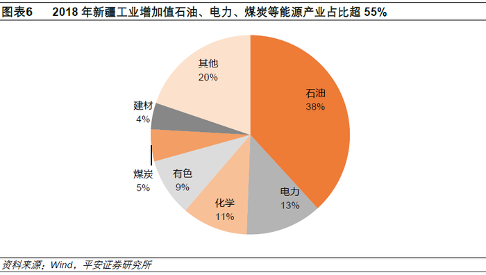 受益于丰富的矿产资源,新疆已成为国家重要的油气生产加工和储备基地、大型煤炭煤电煤化工基地、大型风电基地和国家能源资源陆上大通道。石油、电力、煤炭等能源产业是新疆工业支柱产业。2018年全区实现规模以上工业增加值3564.05亿元,其中石油工业增加值1360.07亿元,电力工业443.44亿元,煤炭工业184.96亿元,合计占全区规模以上工业增加值比例超55%。