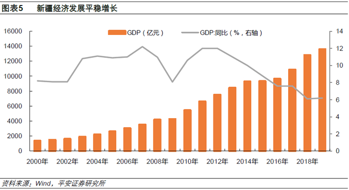 2018年新疆地区生产总值12809.39亿元(居全国第26位),同比增长6.1%。其中,第一产业增加值1692.09亿元,增长4.7%;第二产业增加值4657.16亿元,增长4.2%;第三产业增加值6460.14亿元,增长8.0%。2019年新疆实现地区生产总值13597.11亿元,同比上年增长6.2%。其中,第一产业增加值1781.75亿元,增长5.3%;第二产业增加值4795.50亿元,增长3.7%;第三产业增加值7019.86亿元,增长8.1%。新疆经济体量较小,整体处于产业结构转型期,经济增长模式由主要依靠第二产业向依靠二、三产业转变。