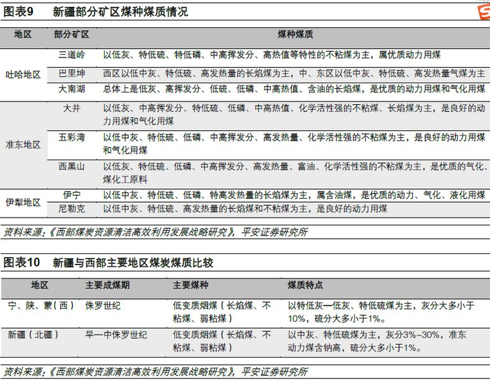 新疆煤种比较齐全,主要以中低变质的长焰煤、不粘结煤和弱粘结煤为主,其次为中变质的气煤、肥煤和焦煤,占资源总量的80.9%,总体上具有低灰、特低硫、特低磷、高中发热量特点,是优质动力煤和化工原料煤,有适合远距离输送的资源条件,分布在准噶尔、吐哈和伊犁地区平原地带;炼焦用煤次之,占预测总储量的19.0%,主要分布在天山北坡的准南煤田和南坡的库拜煤田;贫煤、无烟煤、褐煤很少,仅占0.1%。需要特别指出的是,三塘湖、淖毛湖、黑山、克(布)尔碱等矿区大部分煤炭资源含油率在10%以上,是全国少有的富油煤资源。根据2016年全国矿产资源储量通报数据,新疆动力煤资源储量占其煤炭查明保有资源储量的96%。