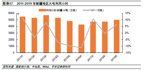 自2014年起,新疆地区火电装机增长放缓,但因区内及外送电落地点用电需求同步放缓,利用小时仍持续下滑。在2016年跌至谷底后,2017年起,新疆火电利用小时开始回升,2019年达到4935小时。