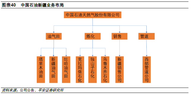 近年来公司在新疆经营业绩显著,塔里木油田已经成为我国重要的油气田和西气东输的主力气源地,截止2019年12月25日,油田油气产量当量继上年迈上2600万吨台阶后,一举突破2800万吨,达到2801.68万吨。其中,生产石油566.68万吨、天然气280.47亿立方米,较上年同期净增176.28万吨。独山子石化是新疆最大的炼油企业,2009年公司建成千万吨炼油百万吨乙烯工程,一跃成为具备1000万吨/年原油加工、122万吨/年乙烯生产、500万方原油储备能力的大型石化公司,成为我国西部油气引进、储运、加工的重要枢纽。西部管道公司负责运营管理包括新疆在内的油气管道,按照国家战略要求,预计这部分资产2020年将陆续进行油气体制改革,装入新成立的国家管网公司。