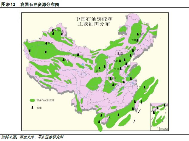 但我国国土面积幅员辽阔,部分地区仍然蕴藏较为丰富的油气资源。我国石油资源集中分布在渤海湾、松辽、塔里木、鄂尔多斯、准噶尔、珠江口、柴达木和东海陆架八大盆地,其中新疆的塔里木油田、吐哈油田和克拉玛依油田位列我国油气资源最为丰富的地区。