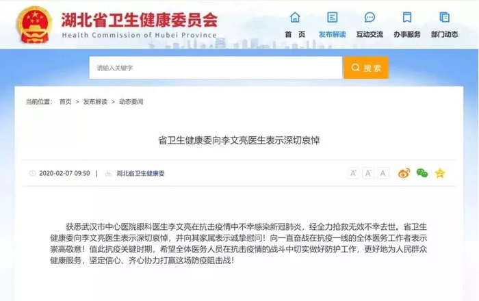 湖北省卫健委也向李文亮医生表示深切哀悼:获悉武汉市中心医院眼科医生李文亮在抗击疫情中不幸感染新冠肺炎,经全力抢救无效不幸去世。省卫生健康委向李文亮医生表示深切哀悼,并向其家属表示诚挚慰问!向一直奋战在抗疫一线的全体医务工作者表示崇高敬意!值此抗疫关键时期,希望全体医务人员在抗击疫情的战斗中切实做好防护工作,更好地为人民群众健康服务,坚定信心、齐心协力打赢这场防疫阻击战!