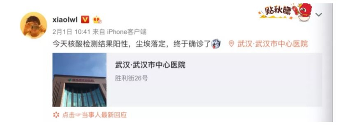 1月12日,李文亮因发烧、咳嗽在武汉中心医院呼吸与重症医学科监护室接受隔离治疗。2020年2月1日,李文亮确诊新型冠状病毒肺炎。他发表微博称,“今天核酸检测结果阳性,尘埃落定,终于确诊了”。