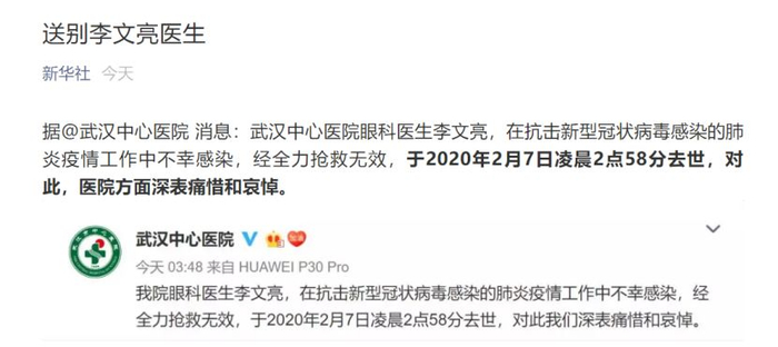 奇迹最终没有发生。2月7日凌晨,武汉中心医院官方微博发布消息:我院眼科医生李文亮,在抗击新型冠状病毒感染的肺炎疫情工作中不幸感染,经全力抢救无效,于2020年2月7日凌晨2点58分去世,对此我们深表痛惜和哀悼。