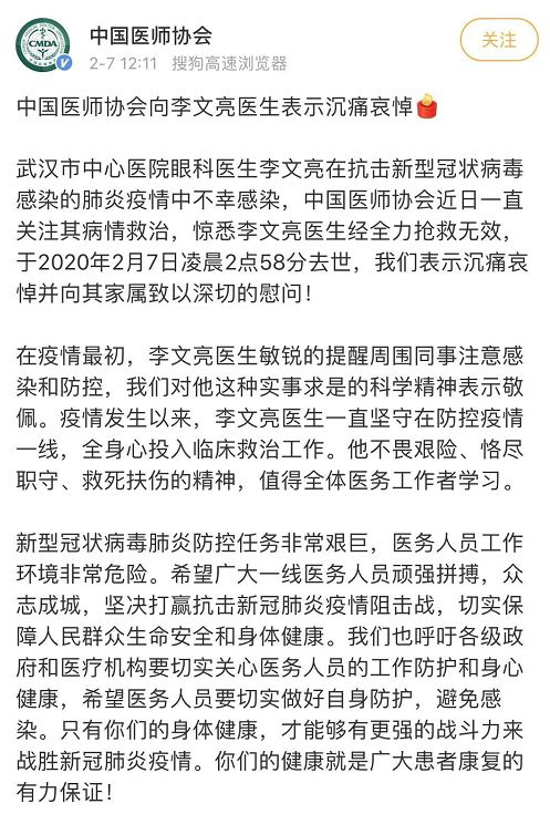 此外,武汉卫健委也在官网发布公告:武汉市中心医院眼科医生李文亮在抗击新型冠状病毒感染的肺炎疫情中不幸感染,因病情恶化,经抢救无效,于2020年2月7日凌晨2点58分去世。我委特向李文亮医生表示沉痛哀悼并向其家属表示深切慰问!