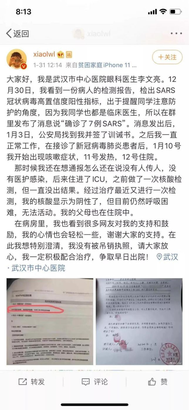 李文亮在微博上回忆,12月30日,他看到一份病人的检测报告,检出SARS冠状病毒高置信度阳性指标。因为他的同学也都是临床医生,出于提醒同学注意防护的角度,他在群里发布了消息说“确诊了7例SARS”。消息发出后,1月3日,公安局找到李文亮并签了训诫书。之后其一直正常工作。