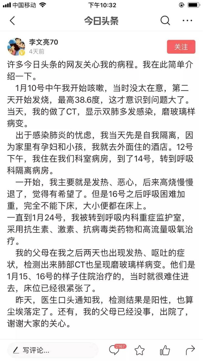 几天前,李文亮还在头条号上汇报自己身体状况。
