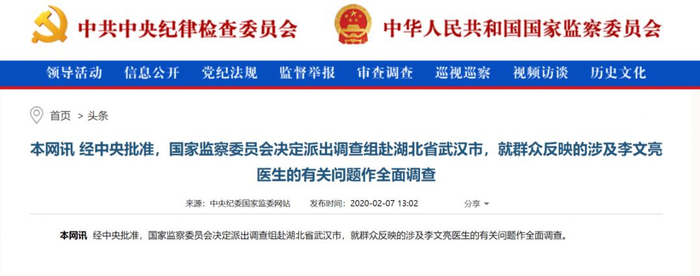 7日中午13时,中央纪委国家监委网站显示,国家监委决定派调查组赴武汉就涉及李文亮医生的有关问题作全面调查。