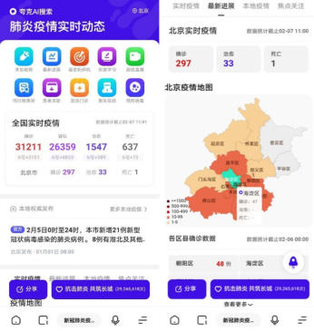 随着疫情进展,夸克发挥智能化搜索大数据实时分析计算能力,集合官方机构与权威媒体发布,精准推送本地疫情动态信息。目前90%以上地级市用户都可以获知本地疫情动态,数十个城市用户可以了解到细化到区县的确诊数据和疫情地图。