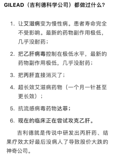 网络上,有人归纳了吉利德在抗病毒领域的贡献,表达虽然不太严谨,但也能反映吉利德的过人之处。