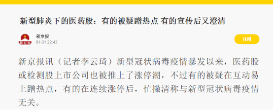 反观我们,趁着近期新型肺炎的热点,有不少家中国上市医药企业主动发布公告,宣称已经研发出分子诊断试剂盒,在销售的产品猛然多了抗病毒的功能……